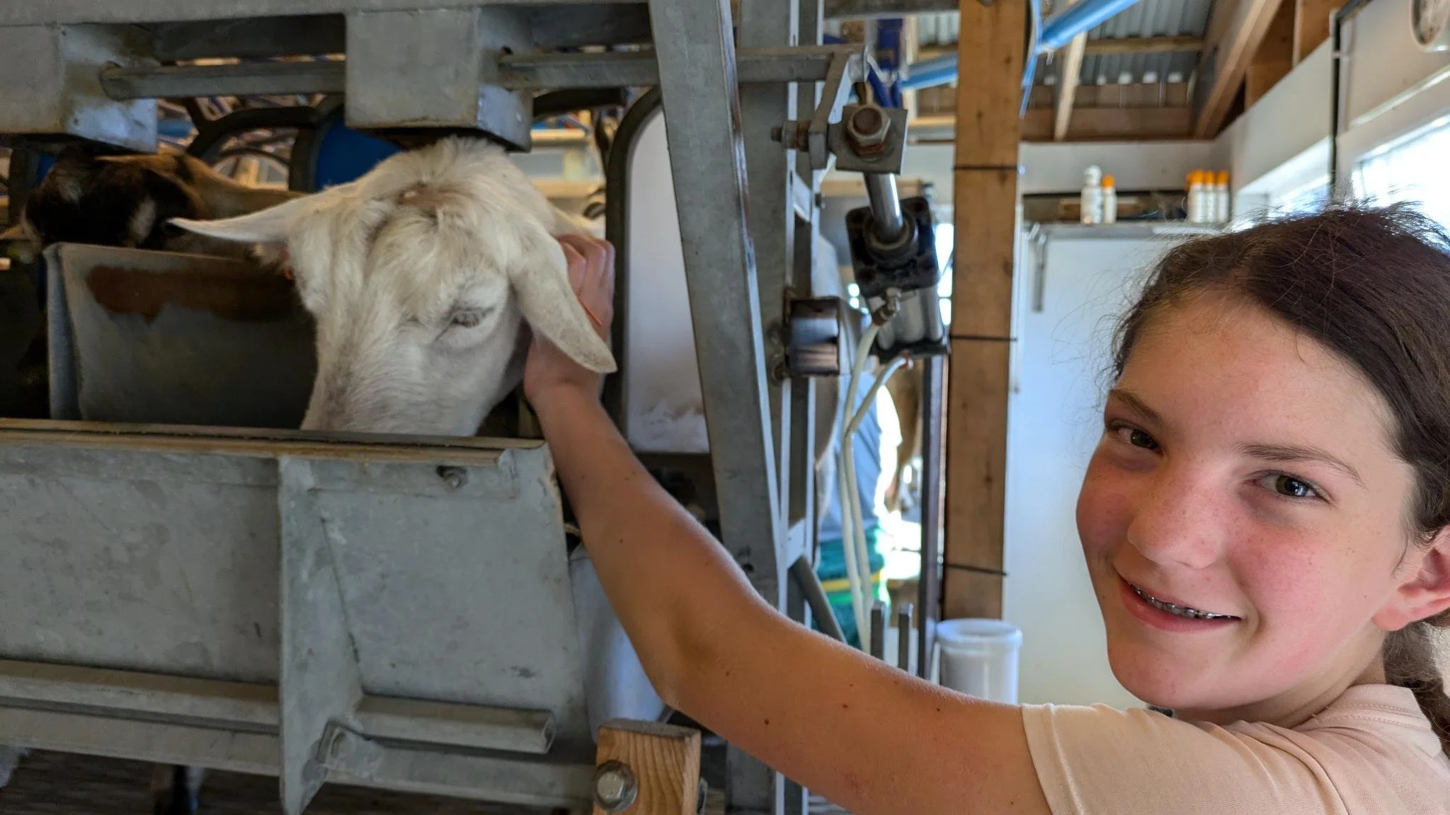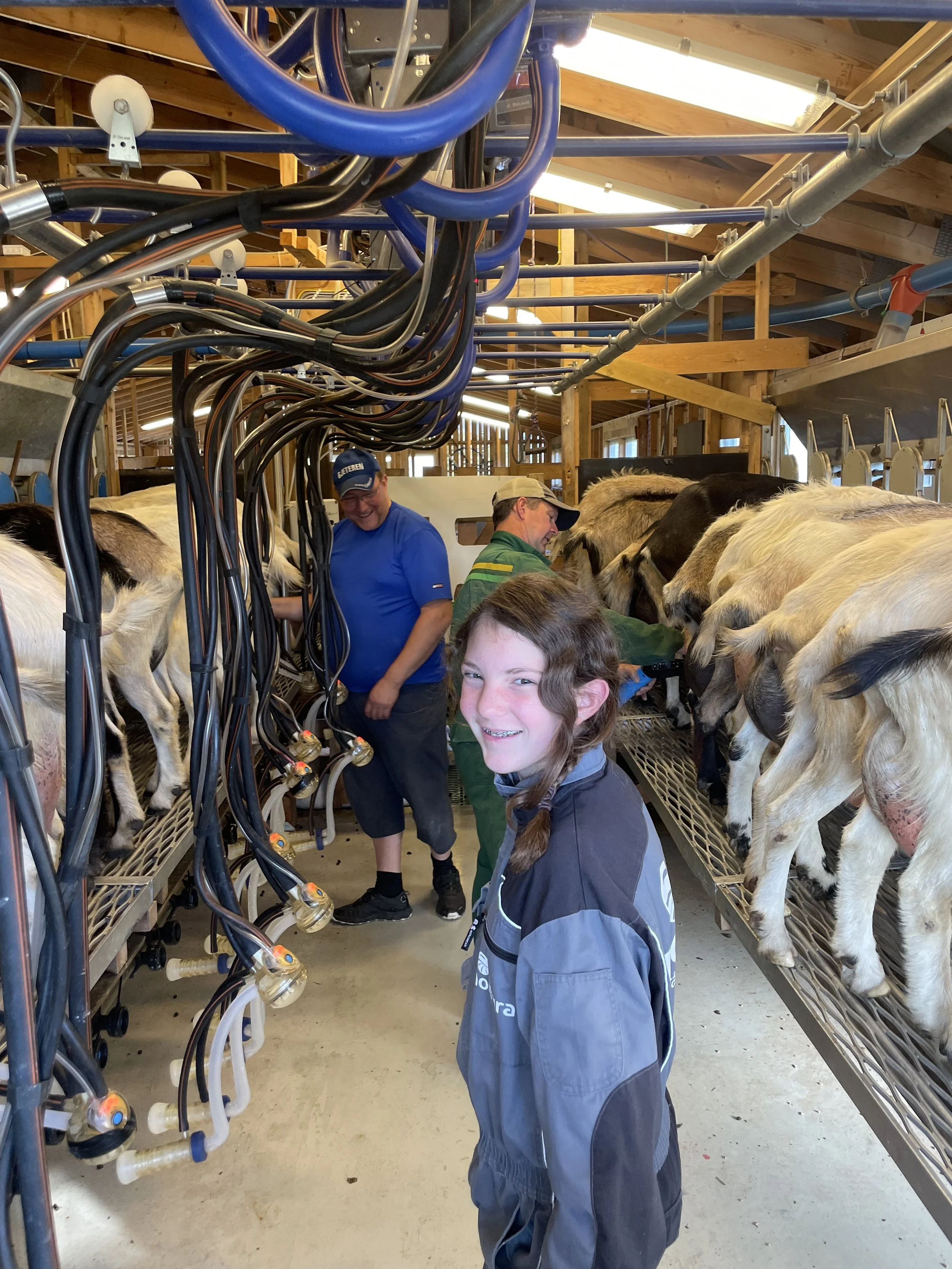 Rewarding, because we learned to milk goats!! We woke up at 5:30am every morning (except two that we had off) and 5pm every evening. First thing we would do is head to the barn to prepare the machines and get the herd in order. All 147 lady goats and 25 kids had to be moved around to different parts of the barn so the milking could go smoothly. We had to learn cleaning, testing, putting on what can only be described as utter pumps (ha!), observing when utters were empty, when a sunburn needed to be cared for, and how to hand milk if necessary (it was necessary for a couple of the girls). We also became acquainted with the quirks of the machines and a few of the individual goats. We had Scarlet, who loved scratches and affection, and one we called Twinkle-Toes, who by her reaction to the milking process, probably wished she wasn’t born a goat, but certainly liked the treats that came with the gig. We had to carry ornery kids, who refused to go to their pen, encourage the old ladies to get up from their naps, and also observed some very disgusting behaviors common to livestock.