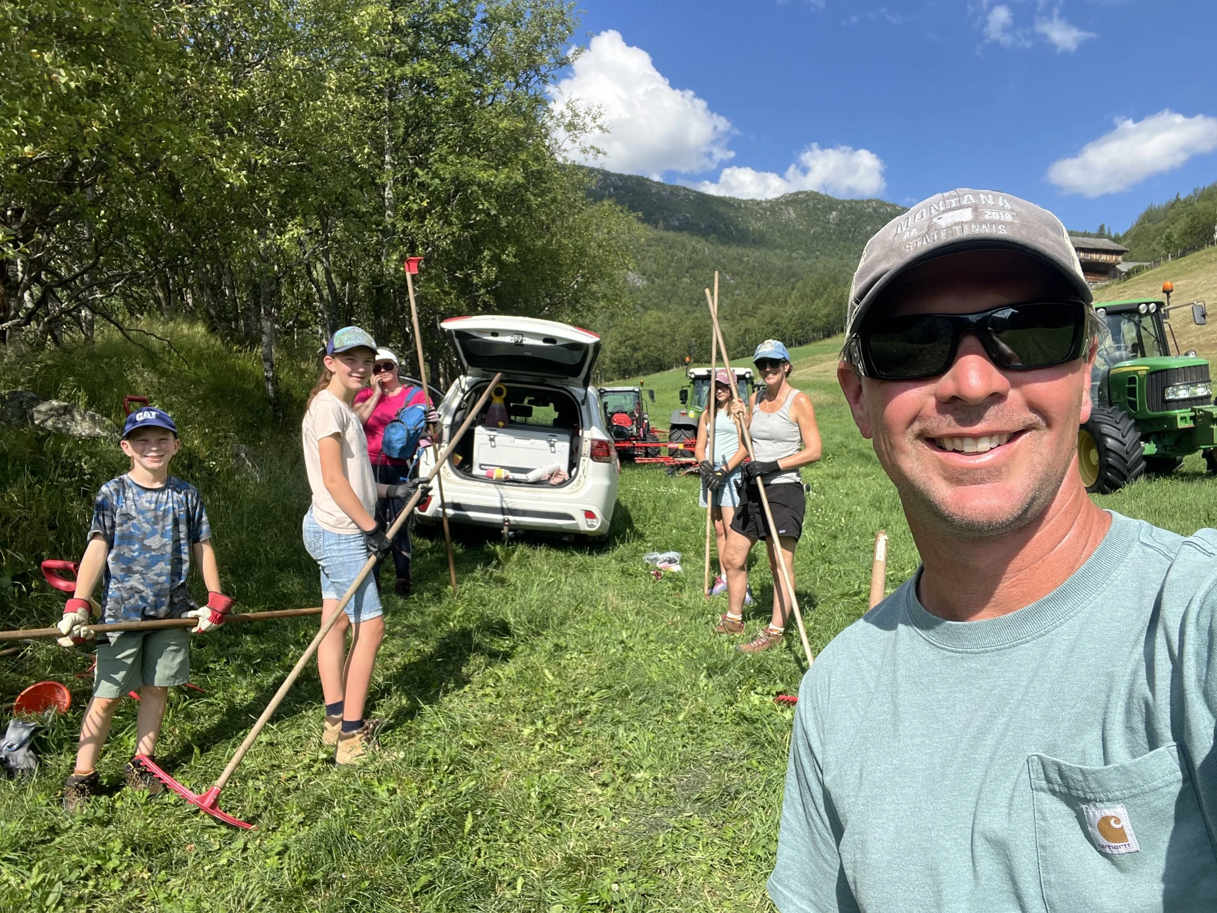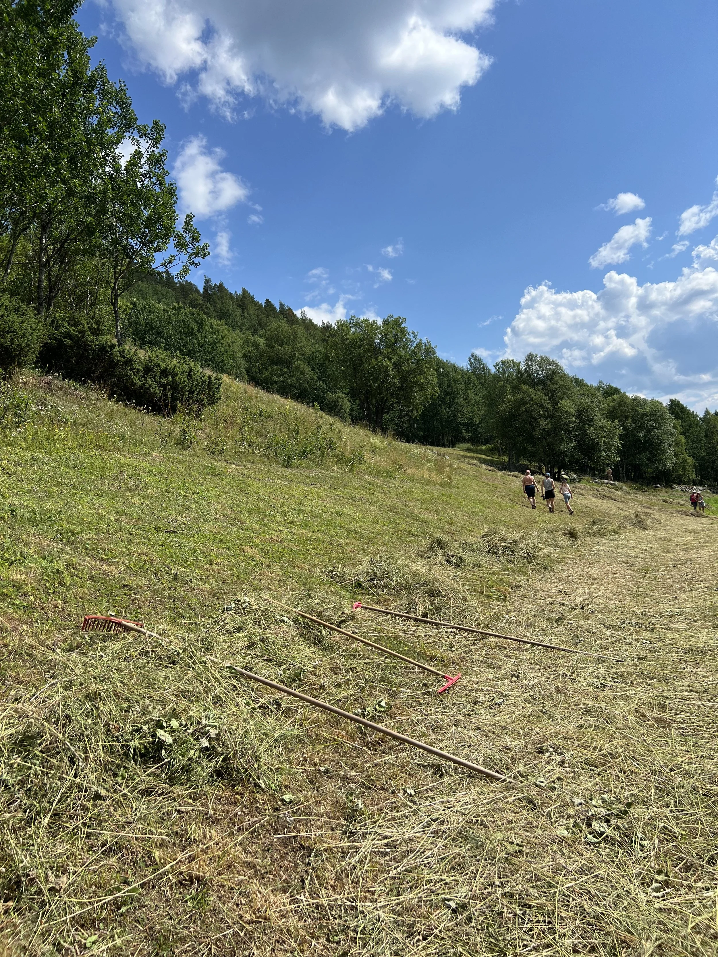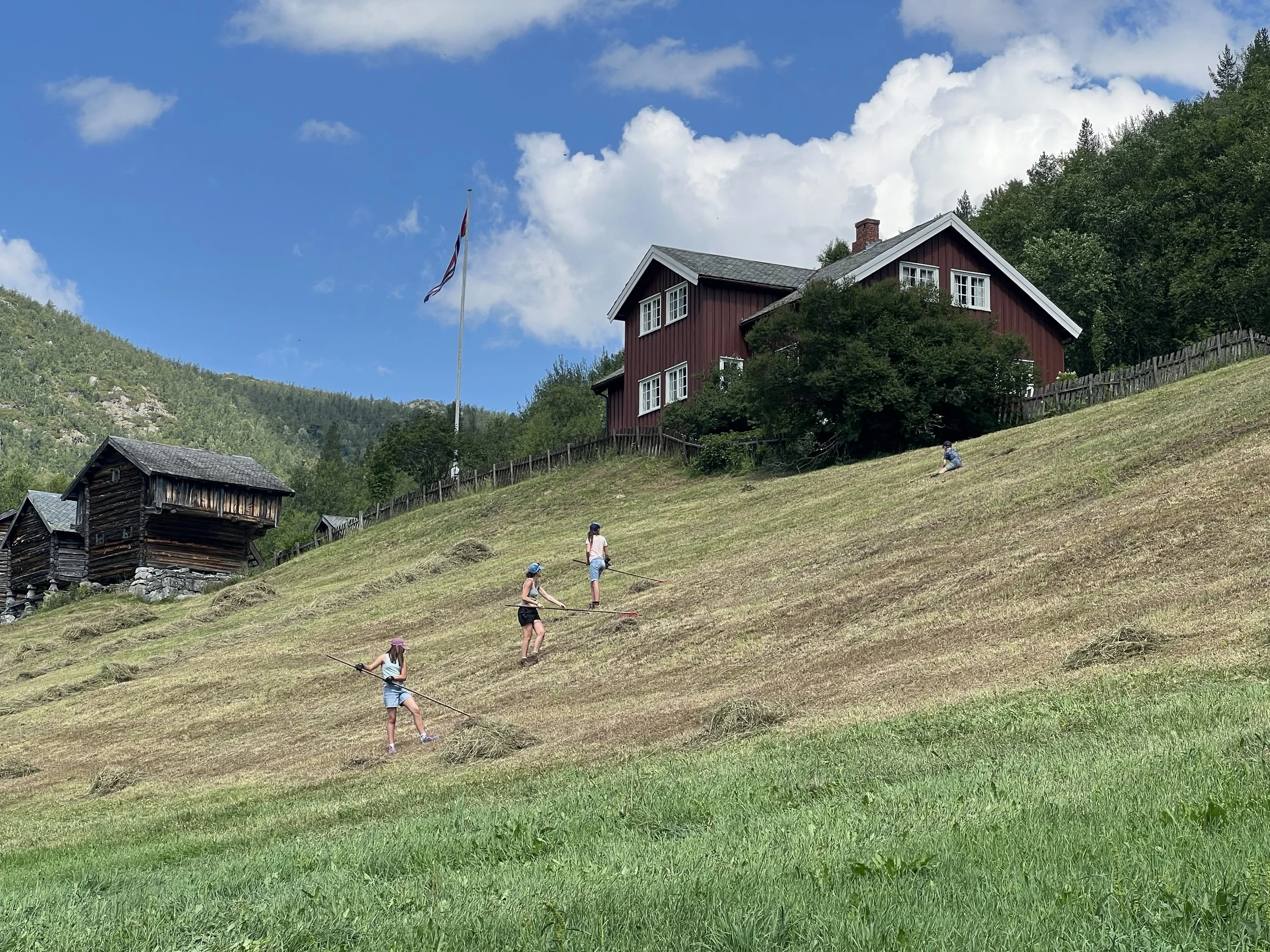 We also gained some Norge-cred by doing some Hallingdal haying over a couple days. I don’t even know how to describe this, other than it is some of THE hardest work any of us has ever done. Basically, we spent hours raking hay on very steep slopes. By participating in this farming tradition, we felt much closer with the farming family. This is the true brutal work of farming in Norway. Milking goats is useful and, over time, it becomes a task of doing the same thing over and over, excellently. But the haying connected us to the land and the people who have worked the valley for centuries. They use a tractor now instead of a sickle for cutting,, but the people still rake the grass down the slopes. It’s no wonder so many Norwegians moved to the Dakotas. I can only imagine how excited they were to work flat land, after the grueling task of haying the mountains.
