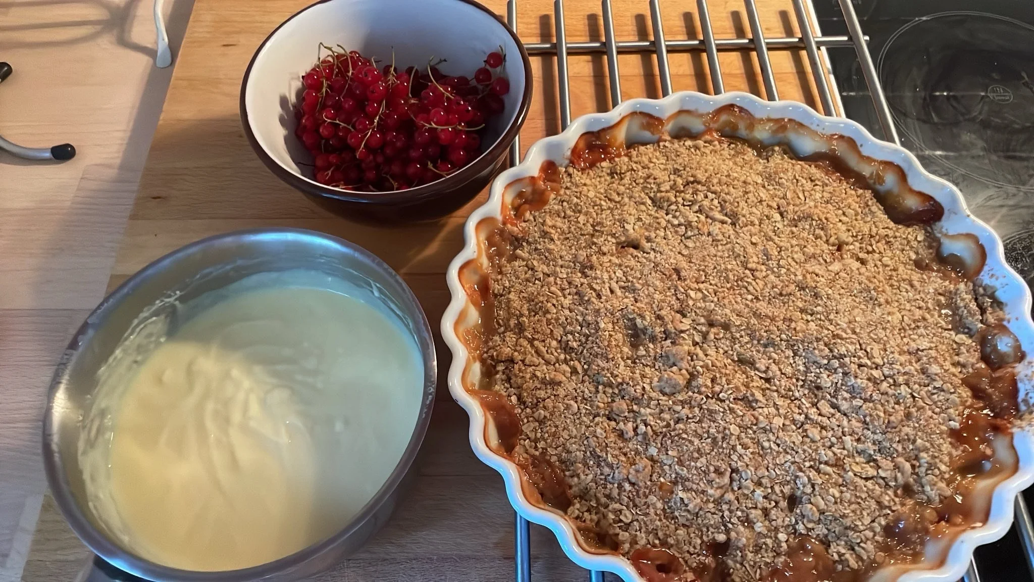 When I tasted the stikklesbær, it was so sweet, a bit like a green grape: the outside is tart, but not so crisp as a grape on the inside. We just had to take some home! So, Karalee and I picked two small buckets as fast as we could (since we needed to go), and had enough to snack on and make a truly delicious crisp! We served it along with the rips and vanilla sauce (custard). Wow. The stikklesbær turned out to be a surprising culinary highlight!