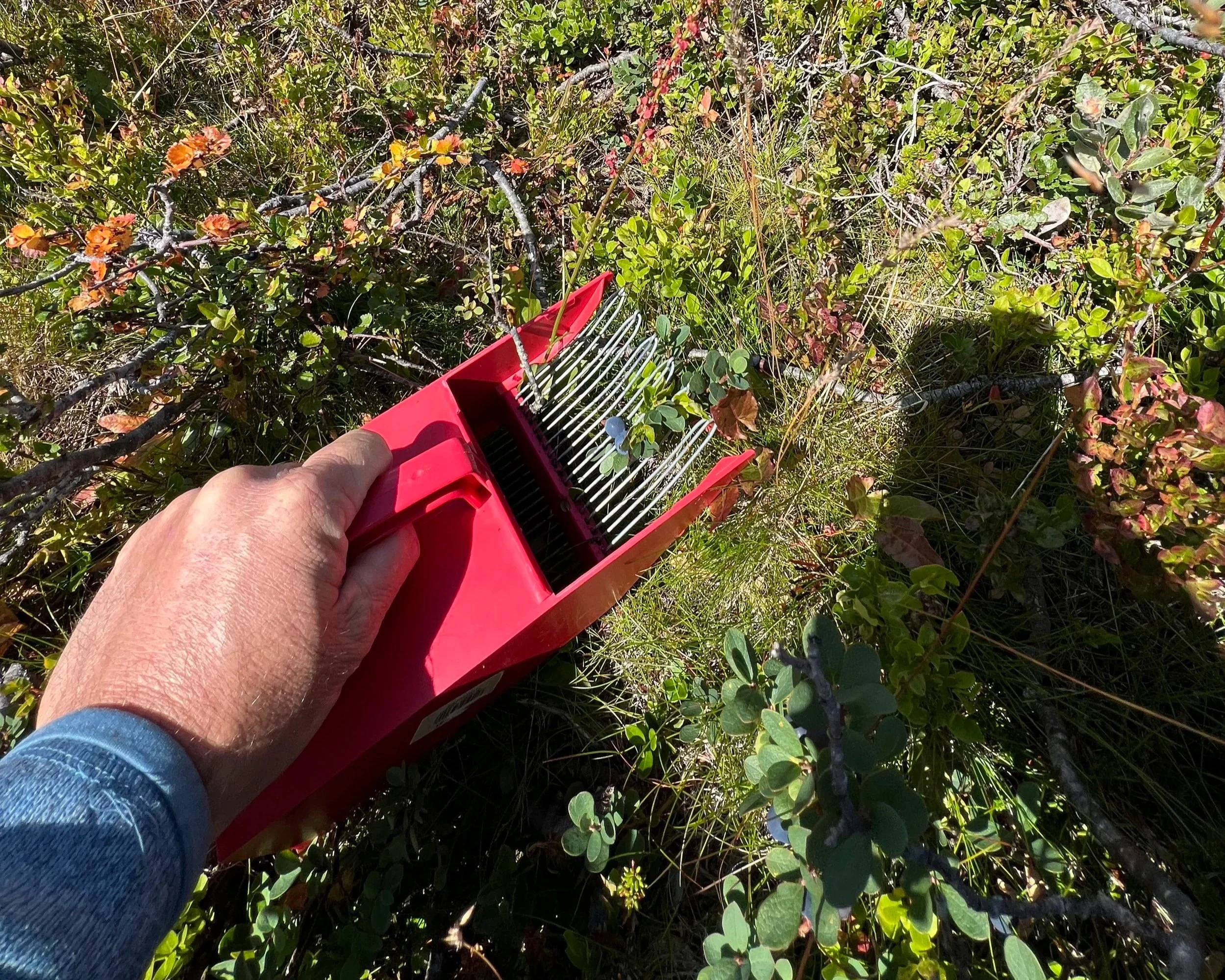 First, our berry picking tools. It’s not complicated. We strap on some sturdy shoes and layers appropriate for the ever-changing weather. Many berries can be gathered by hand, but for several types of berries, we can arm ourselves with this handy berry picking tool and some trusty buckets. Maybe you’ve seen this before, but I had never and find it very helpful! Just slide the metal teeth under the berries on the bush and the fruit falls into the tool’s handle box. Fill the box, empty into the bucket and the picking becomes quite efficient. The Norwegians are so innovative!