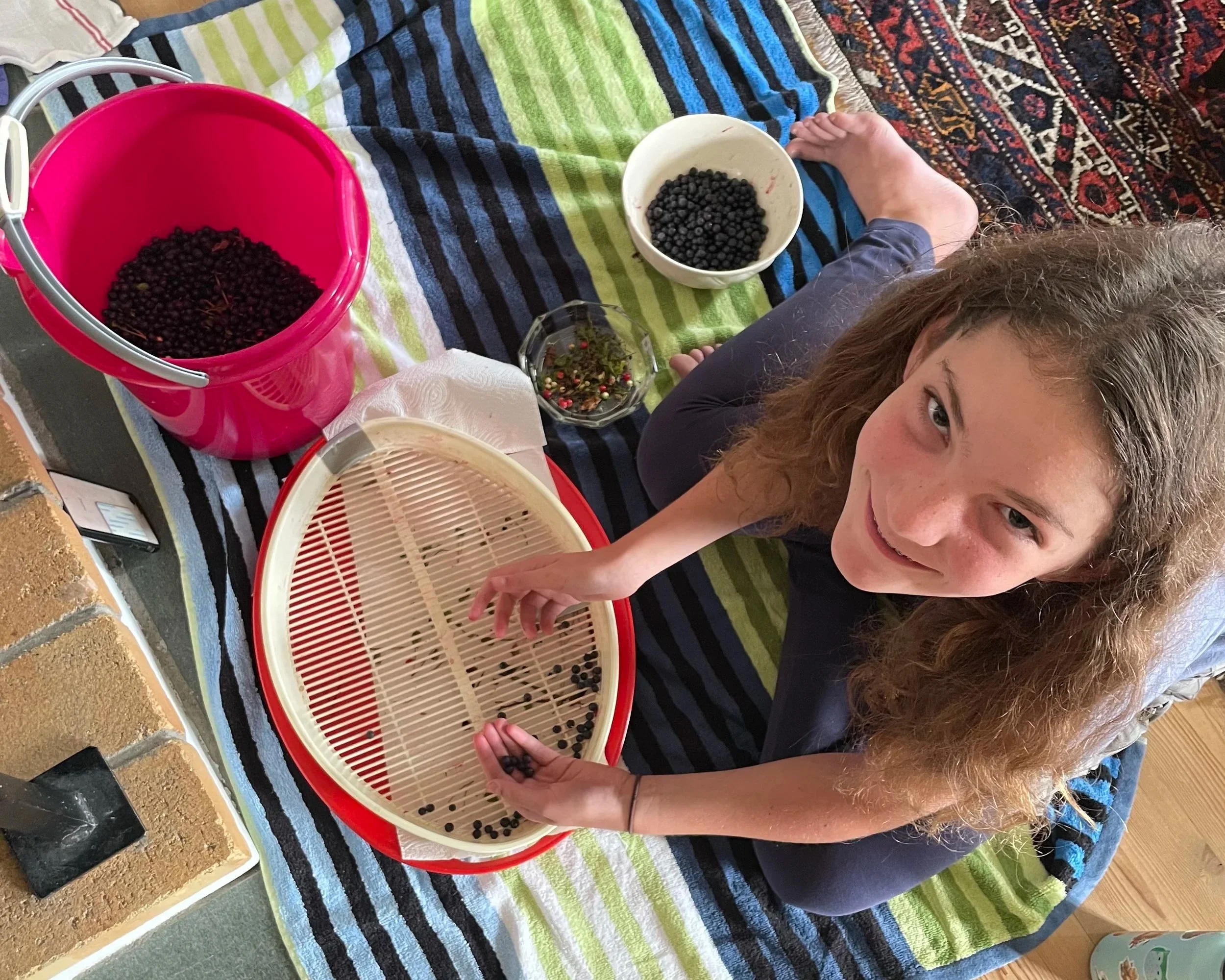 After we pick the berries, we use a simple screen to separate the berries from the twigs and leaves that our harvesting tools sometimes collect along with the berries.